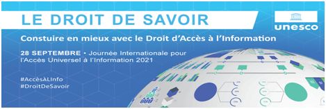 Le thème de la Journée internationale de l’accès universel à l’information 2021 soulignera le rôle des lois sur l’accès à l’information et leur mise en œuvre pour reconstruire des institutions solides pour le bien public et le développement durable, ainsi que pour renforcer le droit à l’information et la coopération internationale dans le domaine de la mise en œuvre de ce droit de l’homme.